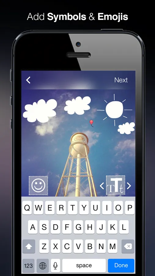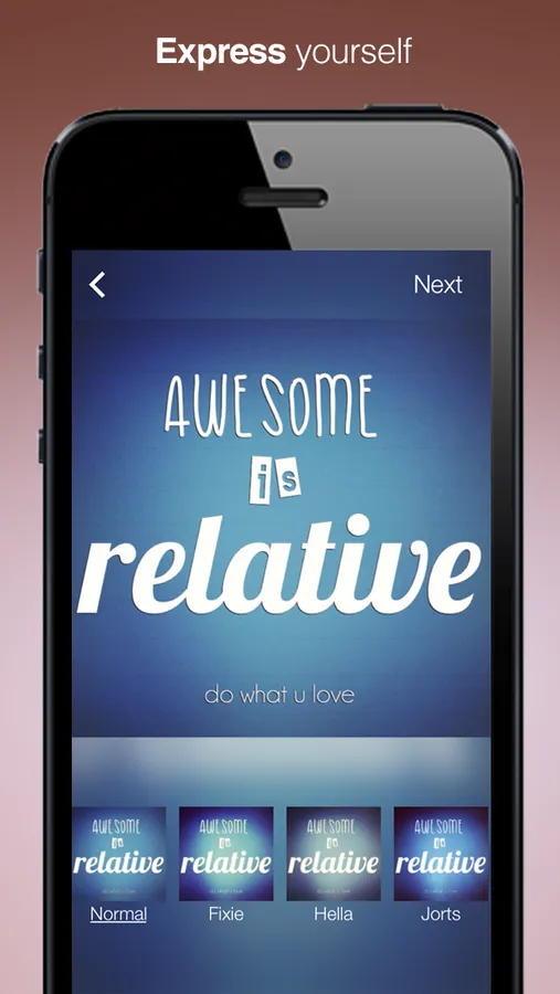 Fact: images with text get more likes. Choose fonts/symbols, add filters, and share to your social channels in seconds.