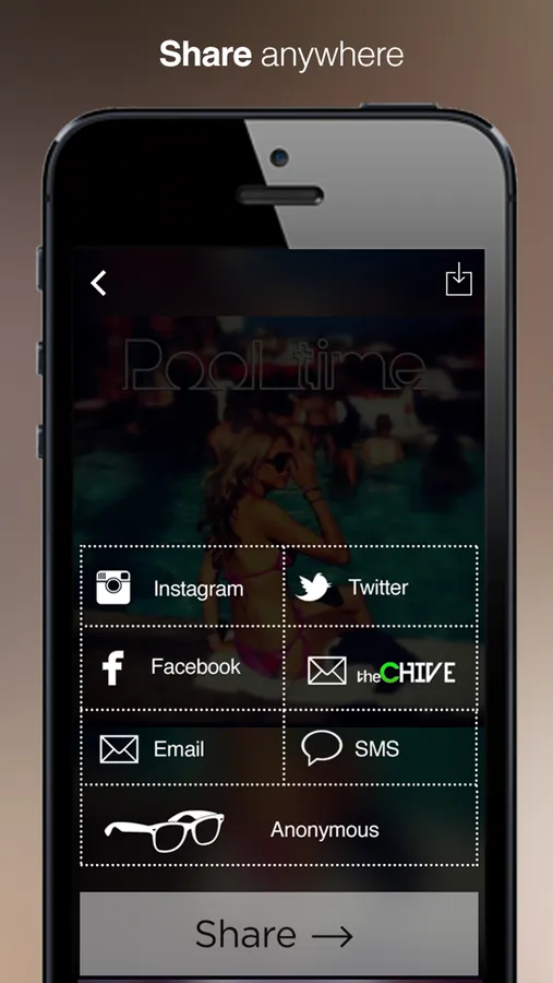 - SHARING: Share straight to Twitter, Instagram, Facebook, The Chive, SMS, or Email with a tap!