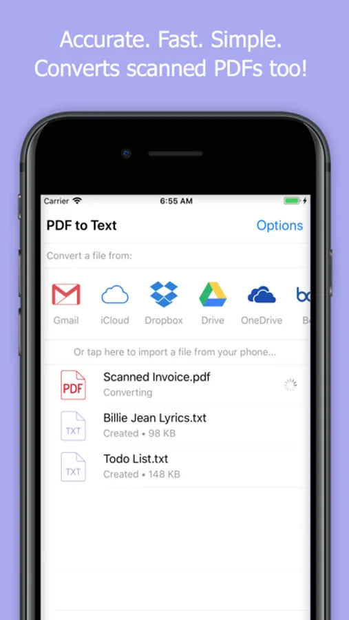 Find your PDF document and open it with PDF to Text, or convert PDFs from your Gmail, Google Drive, Dropbox, Box and OneDrive right within our app. Files are converted by our powerful converting engines hosted on our servers, so the app won't drain your battery or slow down your phone. When conversion ends, text is downloaded on your device and files are deleted from our servers.
