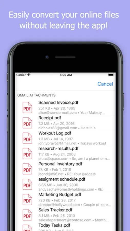 • You can convert Gmail attachments and files from Dropbox, Box, and OneDrive directly from our app