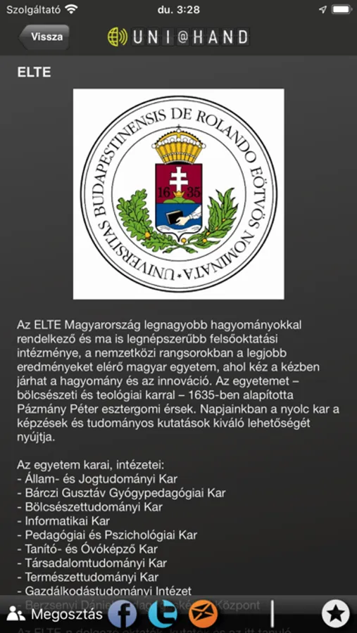 UNI@HAND – Alkalmazás az ELTE PPK hallgatóiért. Az UNI@HAND egy helyre gyűjti a hallgatói élethez nélkülözhetetlen összes információt, legyen szó tanulmányi ügyekről, oktatók elérhetőségeiről vagy a kar épületeinek alaprajzáról. Ha új vagy a környéken, biztos hasznosnak fogod találni az egyetem környékén található étkezdék, kávézók, szórakozóhelyek listáját, amiket hallgatótársaink véleménye alapján állítottunk össze. Az alkalmazás folyamatosan fejlődik, szeretettel várjuk javaslataidat, ötleteidet.