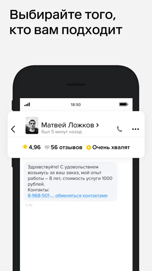 Чтобы найти специалиста, достаточно кратко описать задачу. Укажите свой район или станцию метро, бюджет и удобное время. Откликнутся профи, которым подходят ваши условия. Посмотрите анкеты с информацией об образовании и опыте, примерами работ. Обратите внимание на рейтинг специалиста и отзывы клиентов. В приложении есть чат, где можно пообщаться со специалистом и уточнить детали.