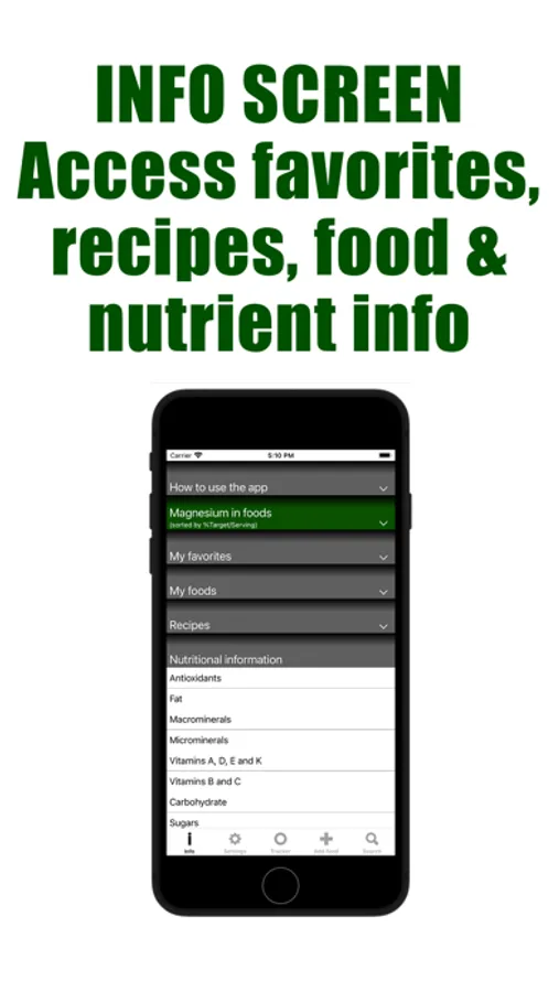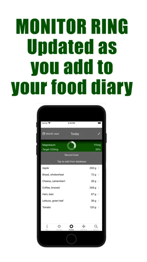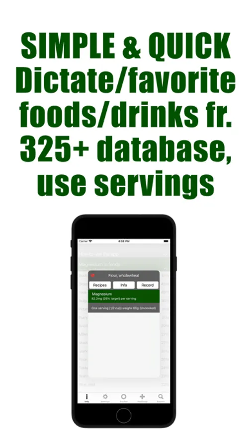 Record the foods and amounts you eat using speech recognition (touch the microphone icon) or by favoriting foods and using the serving sizes provided (mainly those suggested by USDA Food Data Central, but you can change these at any time). Your progress towards your target daily intake will be visible immediately in real-time.