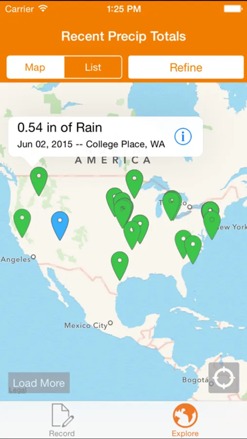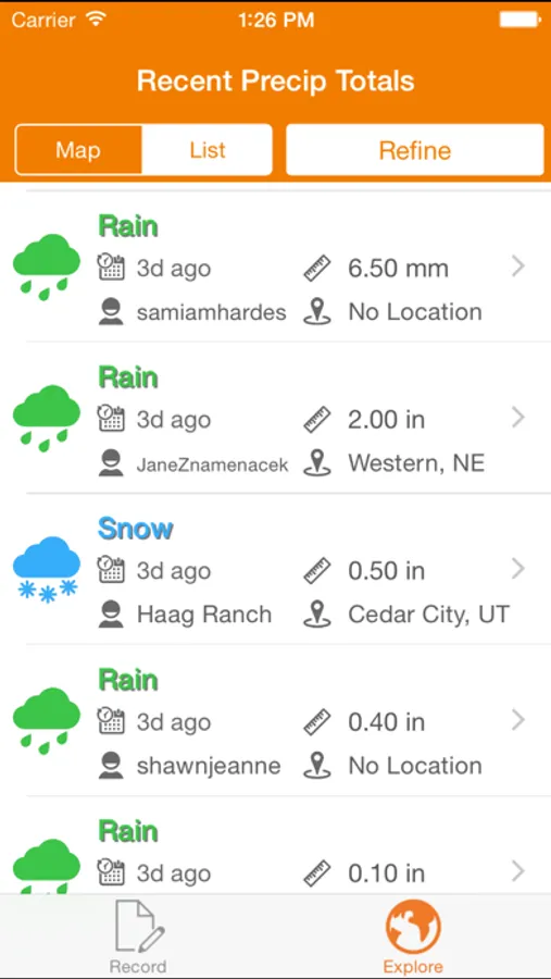 - View a map or list of record precip totals from users across the globe. Filter based on precip type and the time period