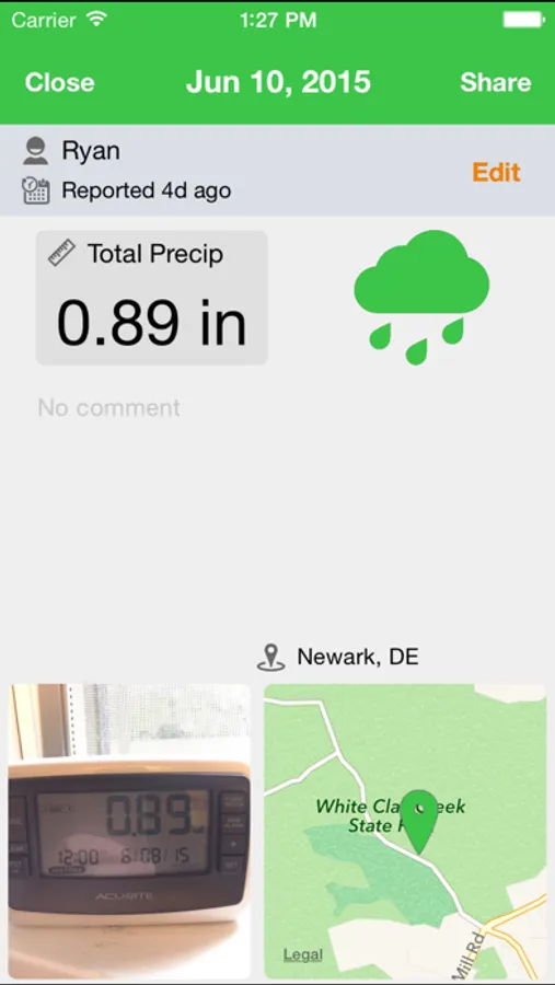 - Attach photos & share your recorded precips with your friends on Facebook or Twitter