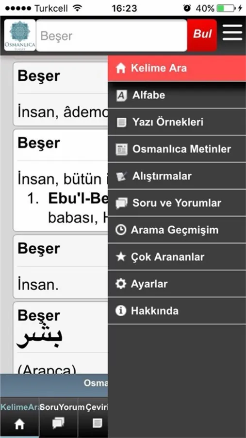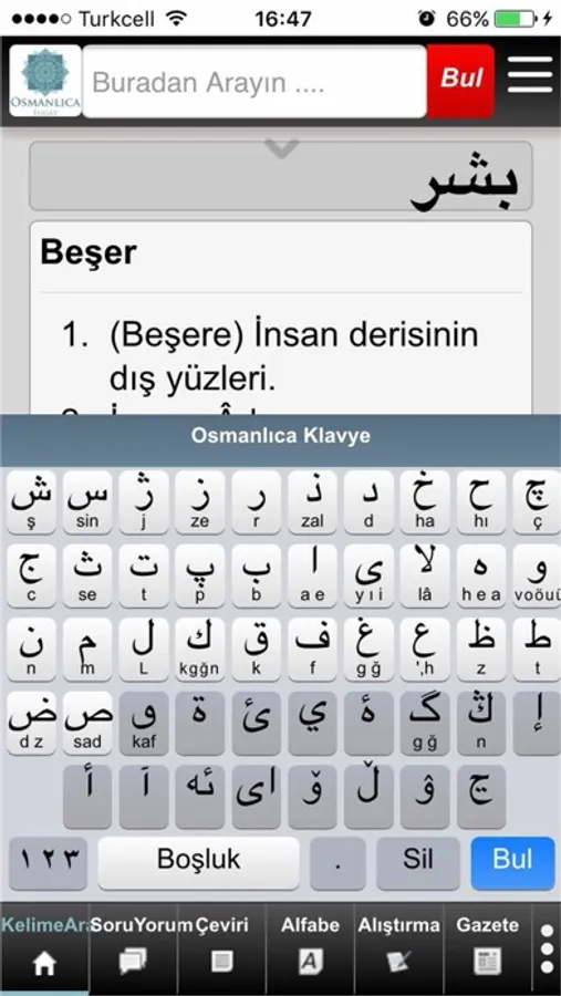 Osmanlıca Türkçe Sözlük aradığınız kelimeleri rahatça bulmanız için tasarlanmıştır. Akıllı arama seçeneği ile yazmaya başladığınız anda imla kurallarını, şapkalı harfleri ve boşlukları gözardı ederek size aradığınız sonuçları düzgün imlalı şekli ile ve osmanlıca yazılışı ile bulur, benzer olanları da listeler.
