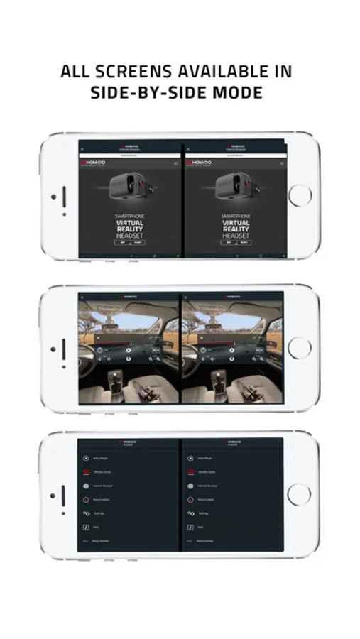 We strongly advice to you use a Homido headset to take the most of mobile VR apps although some of those apps may also be compatible with Google Cardboard, Durovis Dive, Vrase, Samsung Gear VR, Carl Zeiss VR one, Fibrum, Archos / Colorcross, Merge, Jobe VR, AlterGaze, AirVR, Sight VR, Visus, VREye Go, FOV2GO, Refugio, Cortex, Cmoar, VRTX and other HMDs and DIY Oculus Rift, HTC Vive, Avegant Glyph, Magic Leap, StarVR, Microsoft Hololens.