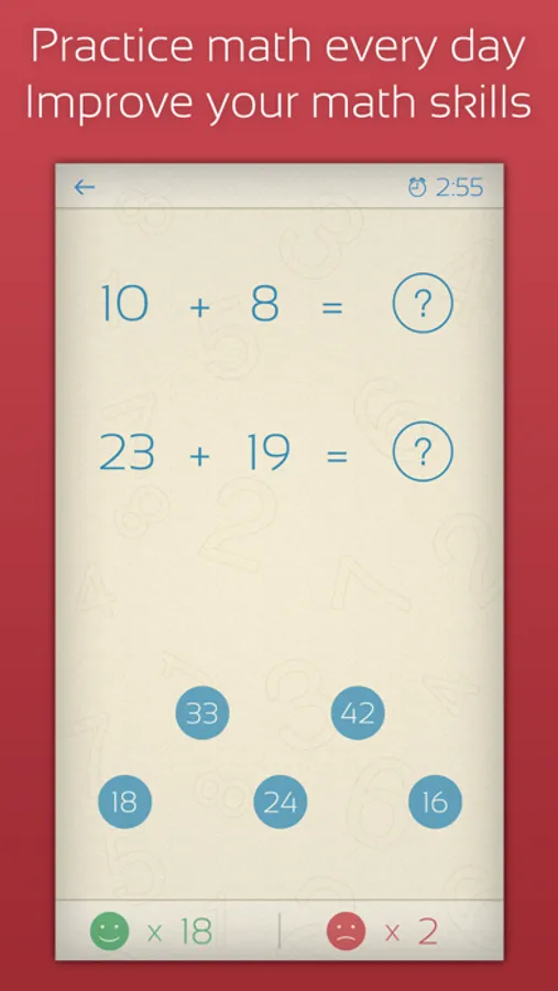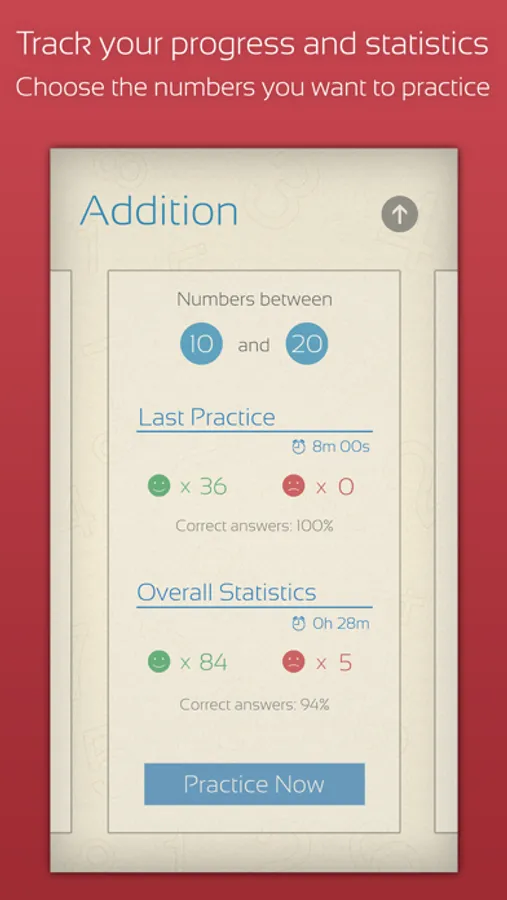 You can choose the numbers you want to practice and the practice duration - 3, 5, 8, and 10 minutes. With the time advancing, the difficulty increases and the questions get harder. When the practice is over your statistics are saved so you can see where you did good and where you need more work.