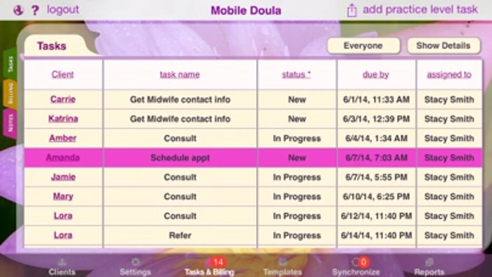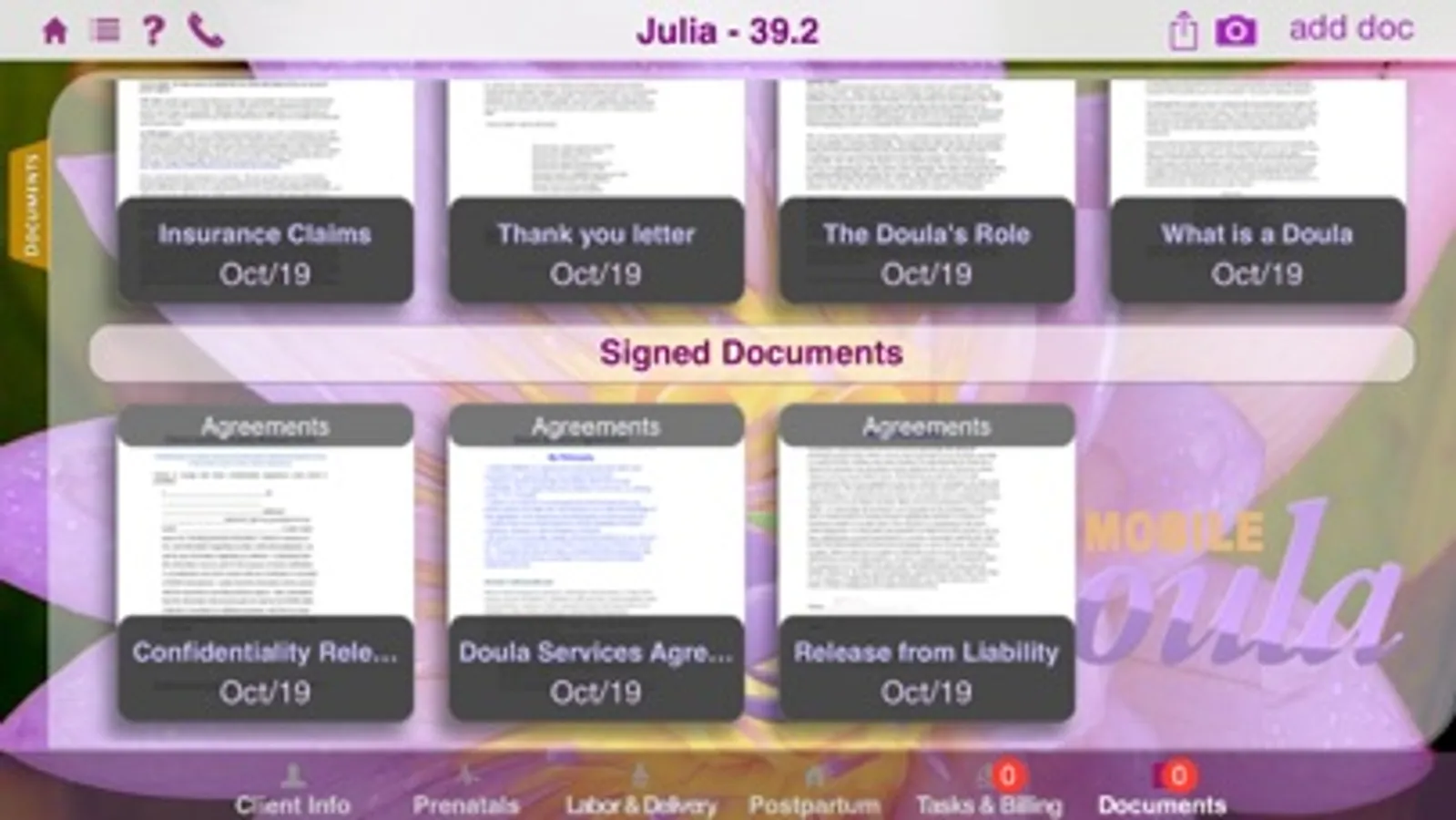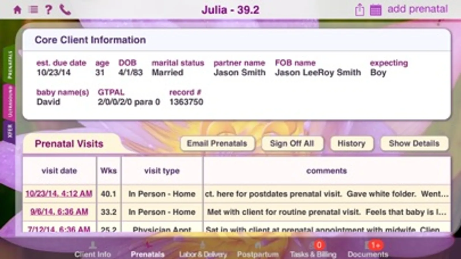 • Record all client info including contact details, birth & labor preferences, health and prior pregnancy info and so much more.