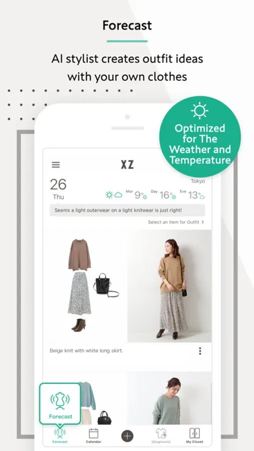 XZ(Closet) is a FREE fashion app for men/women who want to be much more stylish with their clothing items. New mix-and-match outfit ideas will be automatically created and delivered every day.