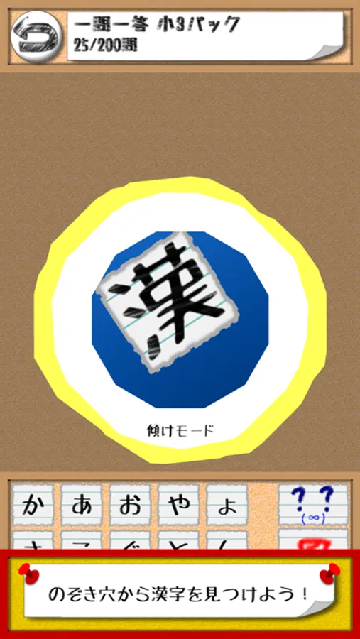 スマホを傾け、のぞき穴の向こうに隠れた漢字を探しましょう(画面をスワイプして視点を動かすようにもできます)。