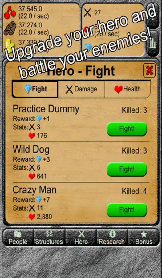 Upgrade your hero's damage and health so you can defeat stronger opponents and research better upgrades!