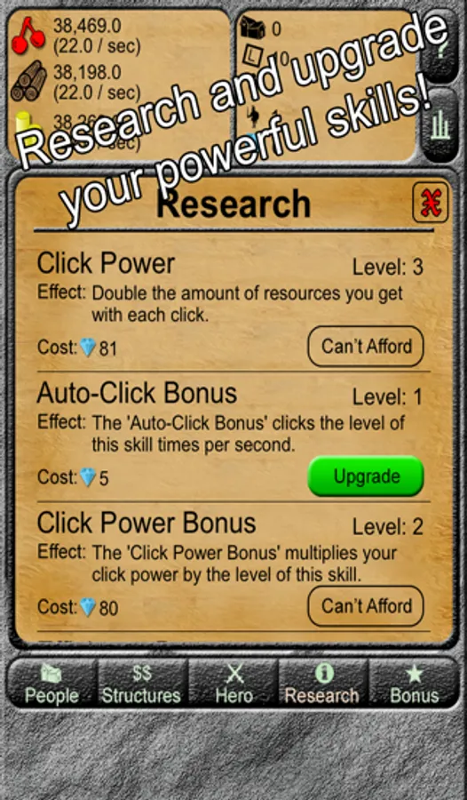 Put multiple bonus skills to use that auto-click for you or multiply your click power and per second income. Do whatever you can to get enough resources for more structures and upgrades!
