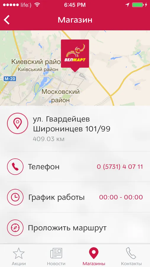- Быстро найти ближайший магазин «Велмарт» на карте или в списке магазинов, узнать режим работы и контактные телефоны