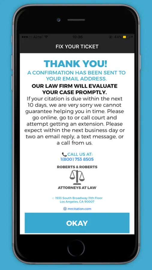 Welcome! to Fix Your Ticket with Roberts & Roberts Attorneys At Law. Our iPhone App is the best way to get the best personal defense attorneys on your side. By using this App you will be able to check the status of your case, capture a photo of your ticket, any court notice, your driver’s license, any other document concerning your citation and send it directly to us for review. Within a day or two we will be contacting you either by app-notification, email, text message or phone.