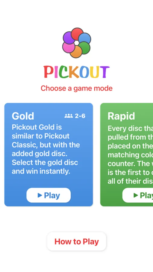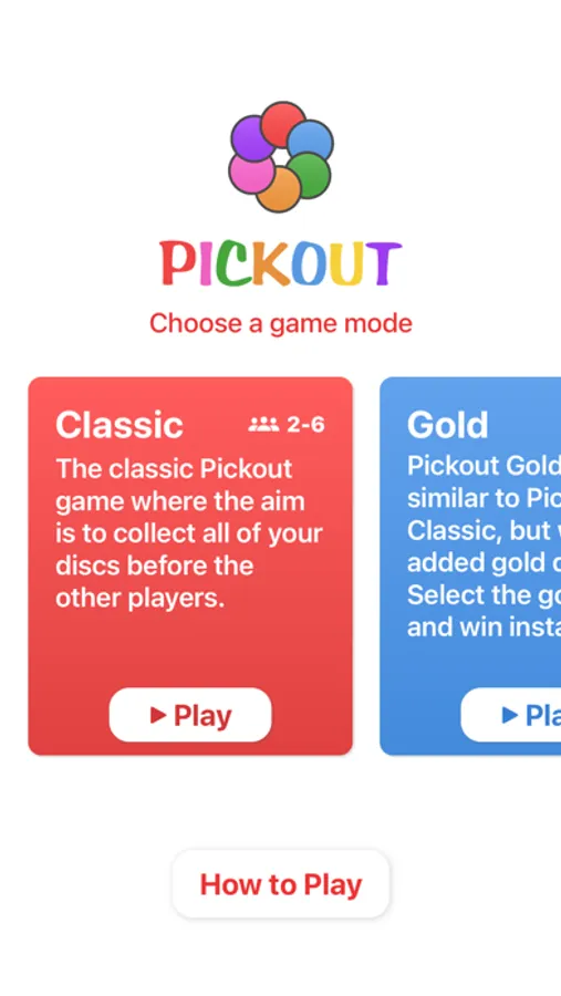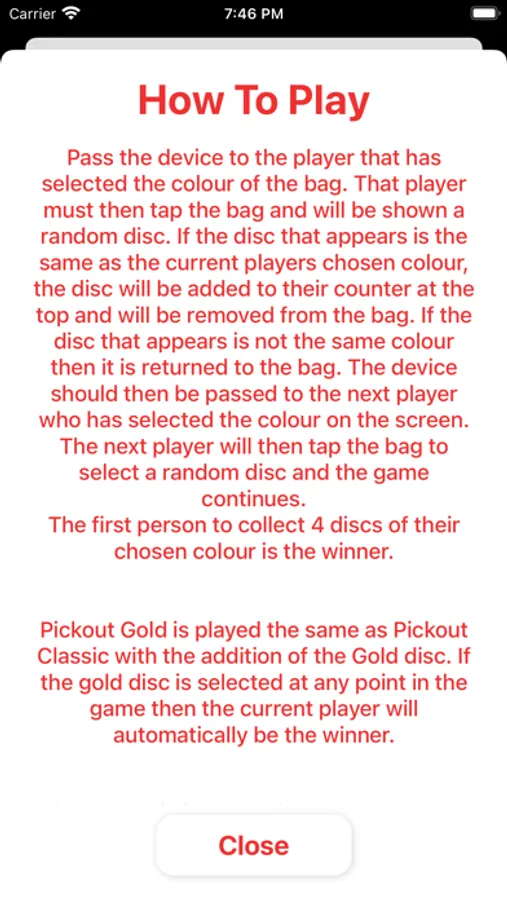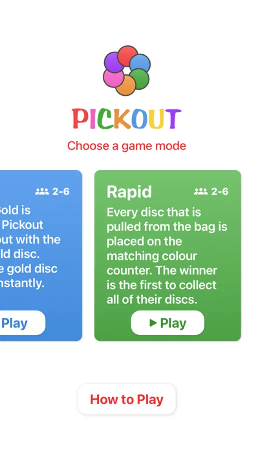 Pickout Classic is played by passing the device to each player in turn for them to complete their counter by randomly selecting a coloured disc from the Pickout bag.