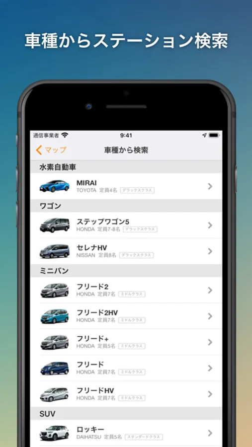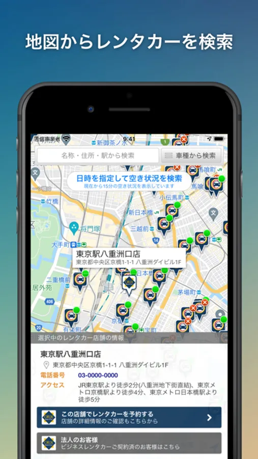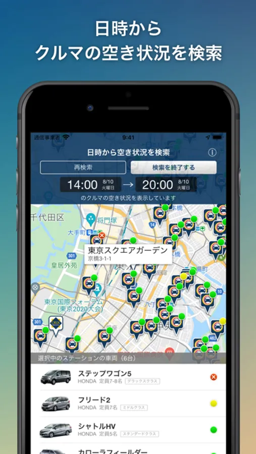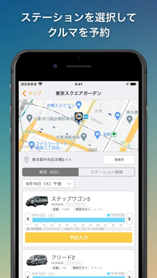 最寄りのステーションを地図から検索、最短20秒でかんたん予約、5分後にはクルマで出発!