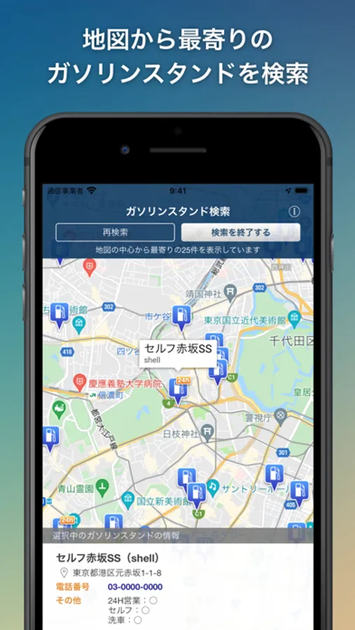 最寄りのガソリンスタンドをワンタッチで地図から検索