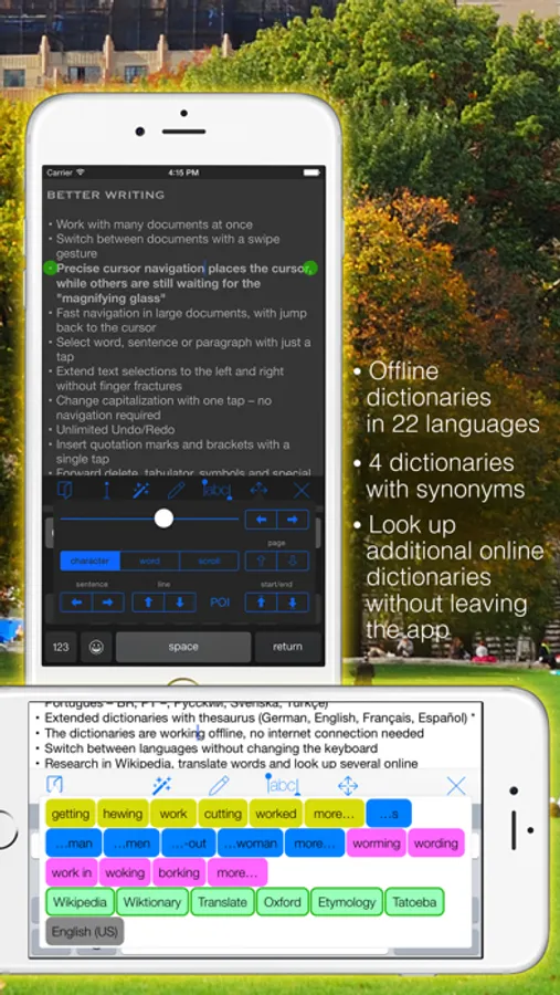 Extended offline dictionaries with synonyms and built-in online references help you with spelling, language, expression, grammar, definition and translation. Precise cursor navigation, fast text selection guides and many additional keyboard functions facilitate typing and correction work.