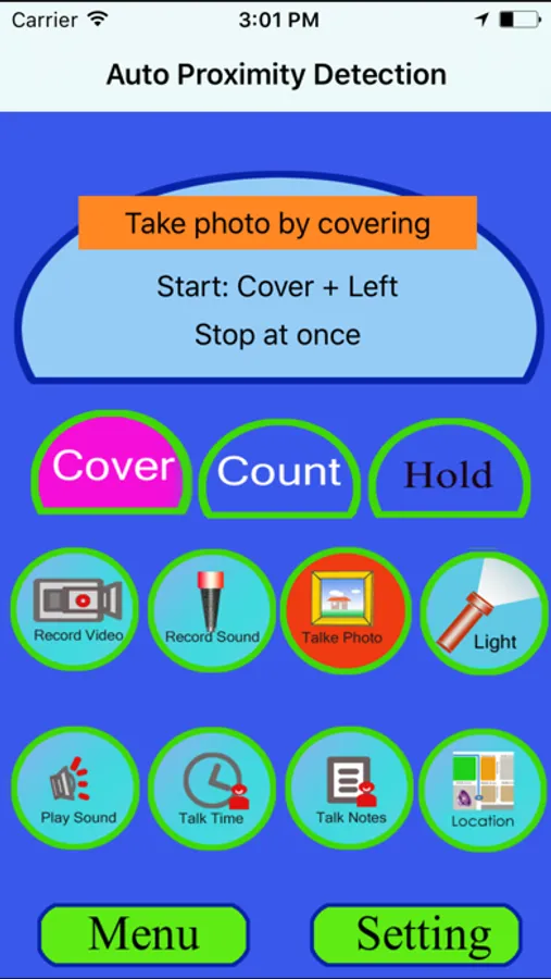 When we are moving or acting, we cannot tap the button on the screen of iPhone or we have no time to watch the screen of iPhone, but we still could cover the screen of iPhone and we still hope to use the iPhone to do the following jobs (1)take photo (2) record the sound (3)record the video (4)turn on/off the flashlight(5) play the sound (6) report the location by talking (7) report the time by talking (8) talk the text notes.(9) count the number one by one.