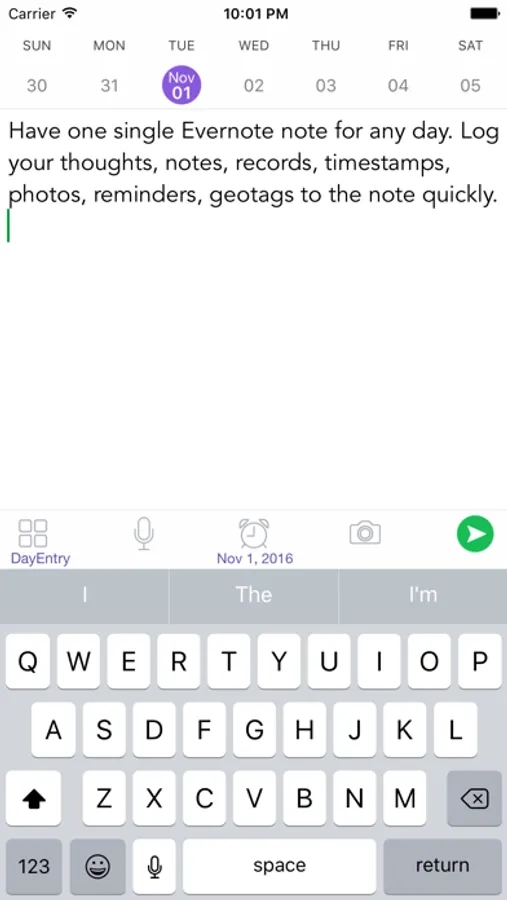 Have one single Evernote note for any day. Log your thoughts, notes, records, timestamps, photos, reminders, geotags to the note quickly.