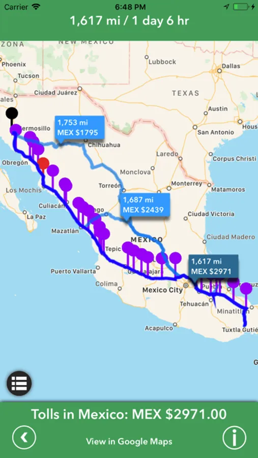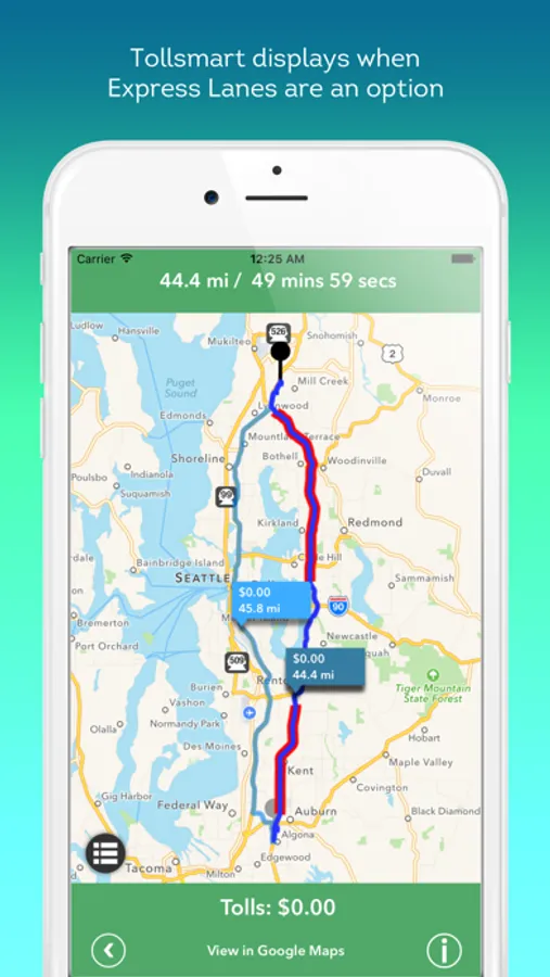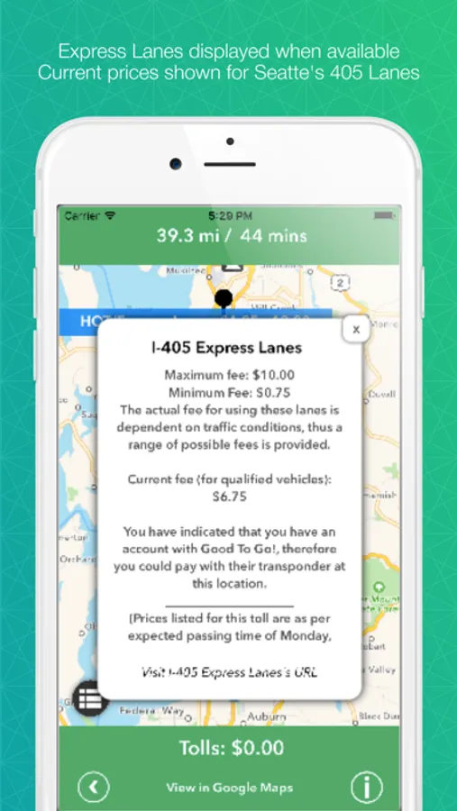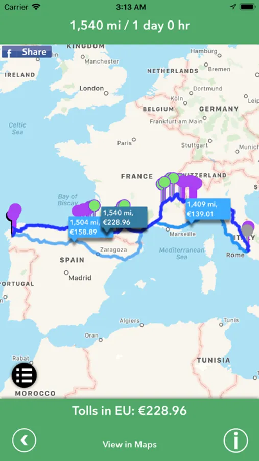 - Display alternative routes that save money (unlock for $2.99 in-app purchase or share on Facebook)