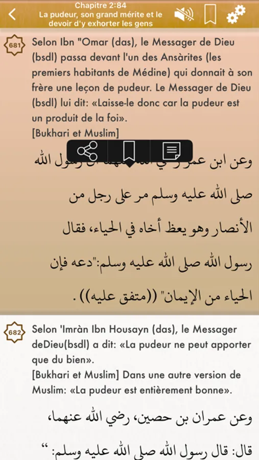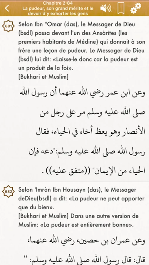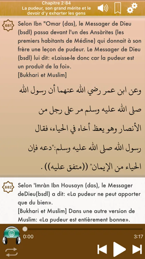 - Les 372 chapitres (extraits du Coran + 1896 Hadiths) + Audio