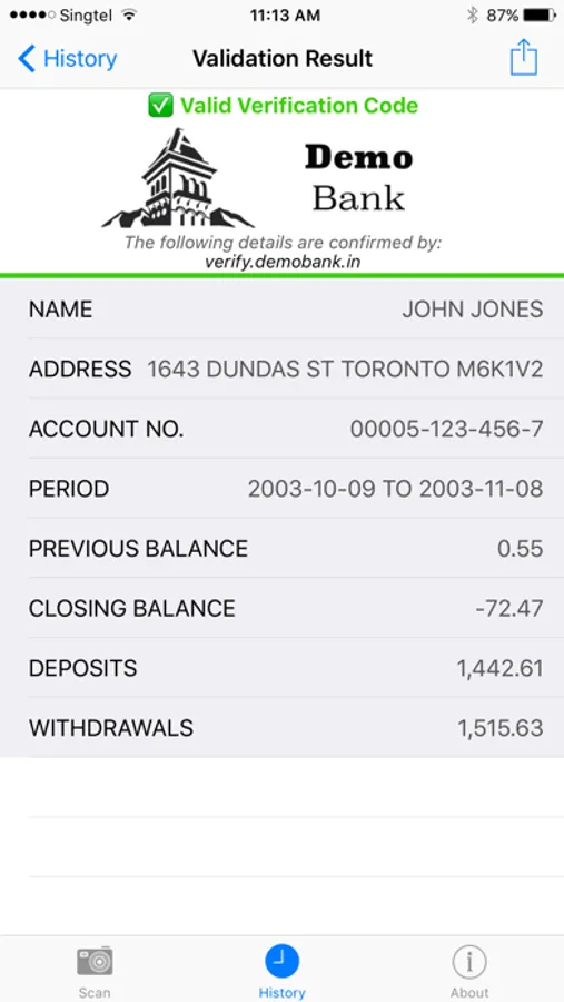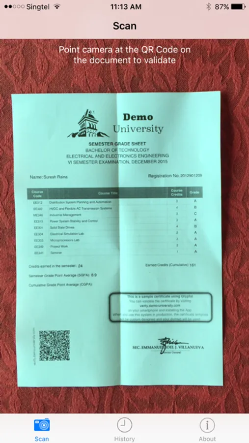Print Record: You can AirPrint the validation record and file it with rest of the paper work for record keeping. To preserve the integrity of the validation record, the printout PDF contains the validation code - along with the verified details of the document.