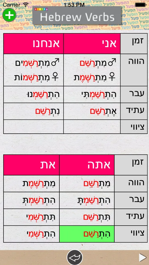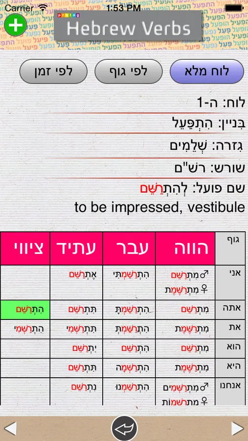 Verb tables are an important and essential tool for properly learning the basics of the Hebrew language. A considerable number of verb tables have been published to date, however we believe that this application offers users a more sophisticated and modern approach. Firstly, the objective was to create a unique high quality product for learners of Hebrew who wish to improve their understanding of verb conjugation. The many grammatical and visual features of this application are designed not only to provide a user-friendly interface but also to serve as an integral and effective educational tool.