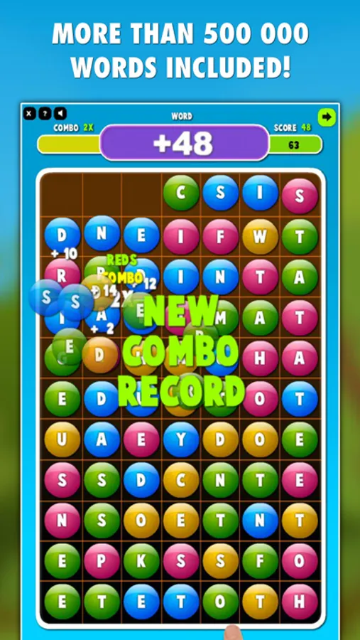 * Put your finger on a letter of your choice and move it to neighboring (horizontally, vertically, diagonally) letters in order to create words, release your finger to submit the words! The game recognizes if the word exists and if so it will change the background behind the word you created into green color! Release your finger to submit the word! Match the color of the first letter in your word to get the combo points! (Example of combo: First letter is pink, each letter with pink color multiplies your points!)