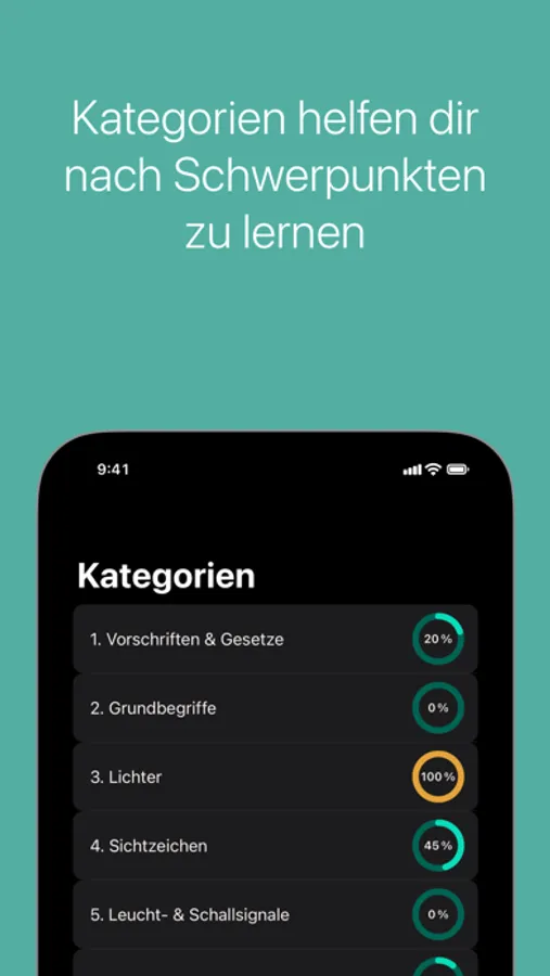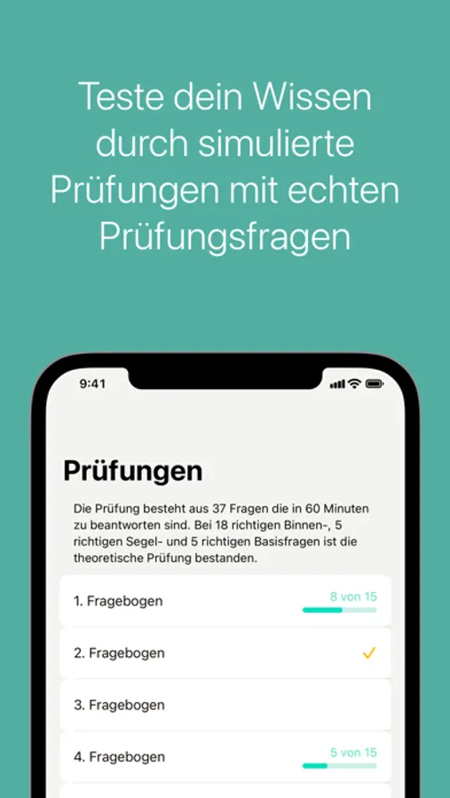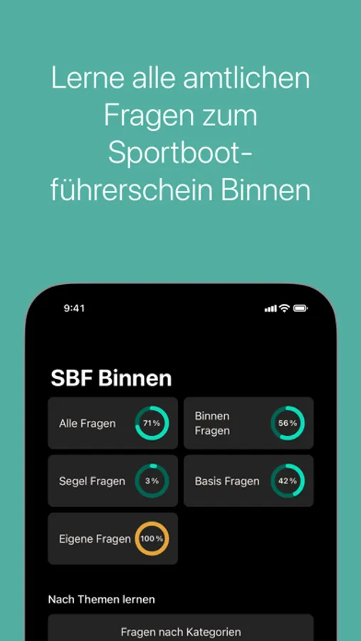 - Lerne alle Fragen nach deinen Bedürfnissen in verschiedenen Kategorien oder an Hand des gesamten Fragenkatalogs für den amtlichen Sportbootführerschein.