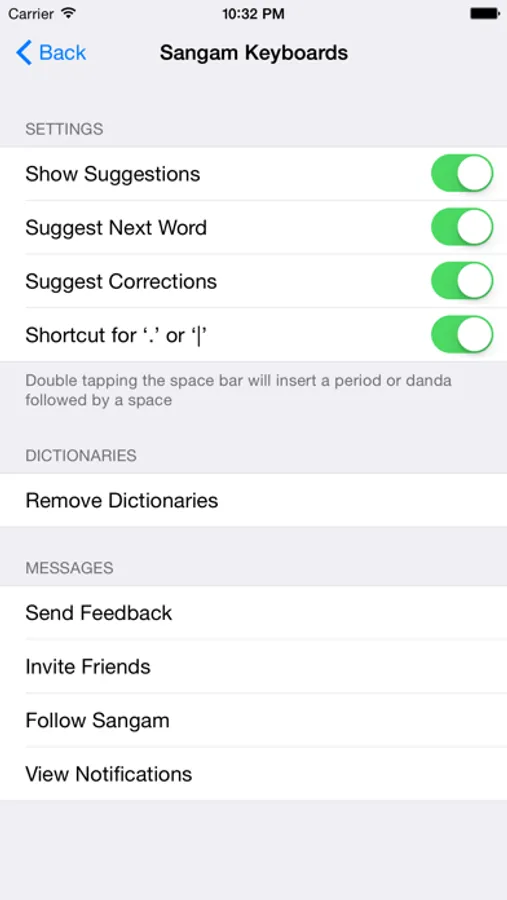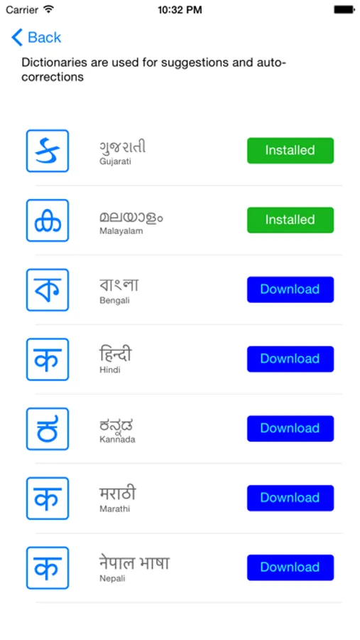 Sangam Keyboards is a suite of keyboards for South Asian languages that include features such as word-suggestion, auto-correction and next word prediction. The current version supports: Assamese, Bengali, Gujarati, Hindi, Kannada, Malayalam, Marathi, Nepali, Odiya, Punjabi, Sanskrit, Sinhala, Tamil and Telugu. Some of these languages have two keyboards: one with the native script and another using the Roman script. More languages will be added in the coming versions.