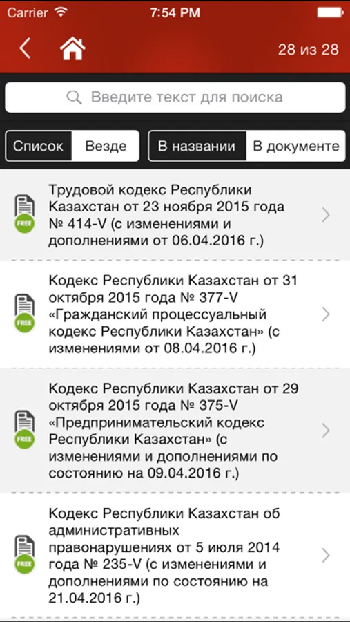 Бесплатно основные правовые документы: Конституция РК, все Кодексы (в том числе кодексы стран СНГ) и все основные законы.