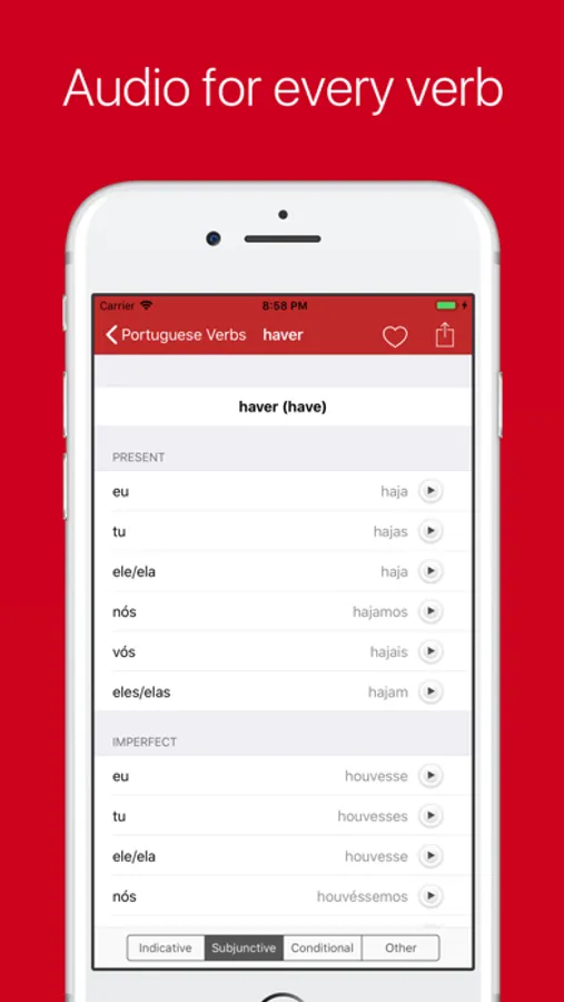 Now with audio!! Not sure how to pronounce a verb? You can now hear how every verb is pronounced. Just tap on the button next to the conjugation. Note: this functionality requires an Internet connection.