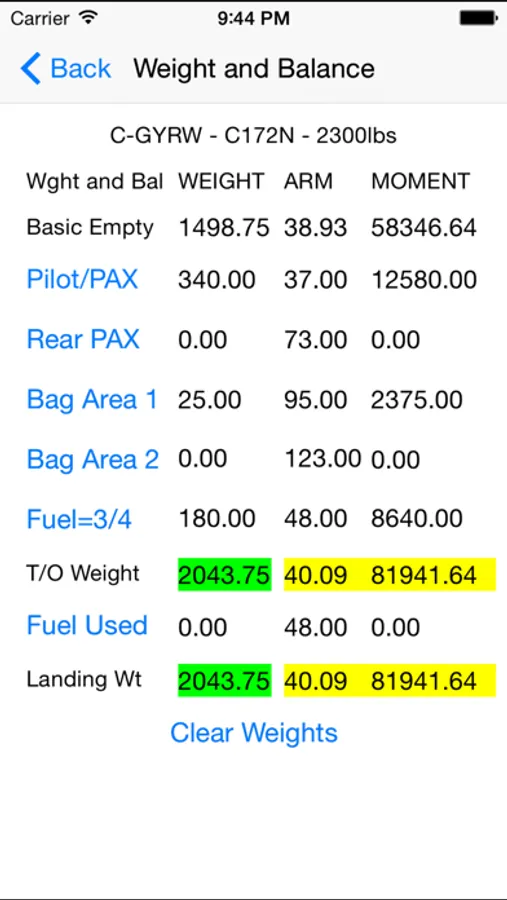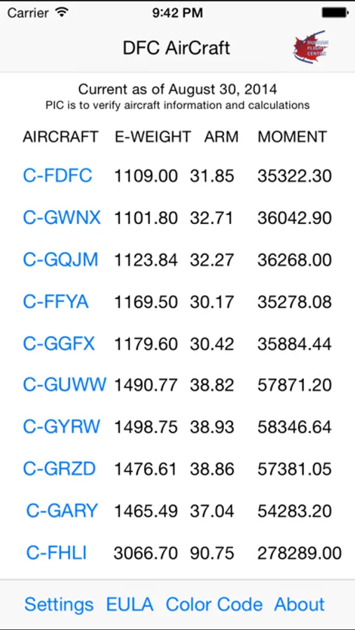 Durham Flight Centre weight and balance calculator is specific to DFC planes. The app holds the current basic empty weight, arms and moments of each DFC plane. If the BEW or Moment for the plane changes, the app will be updated and distributed to the pilots who have the app on their device and the device is able to receive updates.