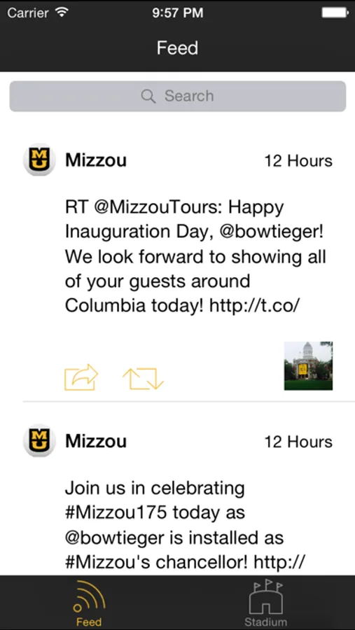 A low bandwidth application that allows fans to receive, retweet and share social media messages from designated Mizzou Athletics Twitter accounts (a personal Twitter account is not required), while also providing parking and in-stadium amenity information when inside Memorial Stadium.