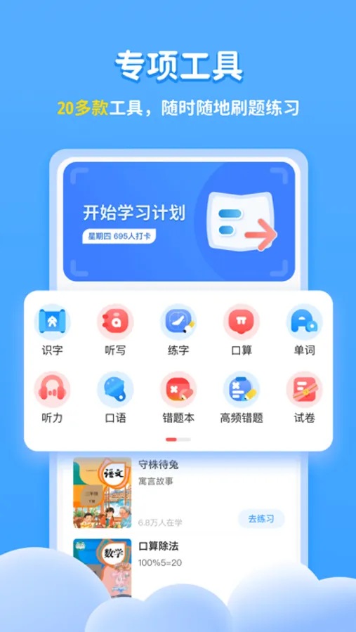 涵盖小学语文、小学数学、小学英语全科知识点,配备识字、听写、练字、口算、单词、听力、口语、错题本、知识点、课本点读、听课文、作文、字典等20多款智能教辅专项工具,100万题库习题量,随时随地学习练习;