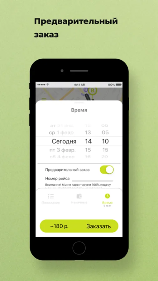 Выберите опцию “Предварительный заказ”. Поиск автомобиля начнется незадолго до заказа поездки, и автомобиль приедет к назначенному времени. Также вы будете заранее знать стоимость поездки.