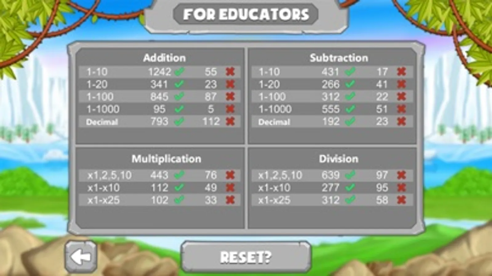This feature was created to offer insight of kids' math progress to teachers at schools, as well as to parents and tutors at home. It shows the number of correct and wrong answers to math questions during the game. These results are shown individually for all difficulty levels, addition, subtraction, multiplication and division, indicating which math operation and which range of numbers create problems for kids and need to be worked on. In this manner, student assessment is being done without them being aware of that, which is very convenient for the students themselves because they are relieved of the pressure of being tested.