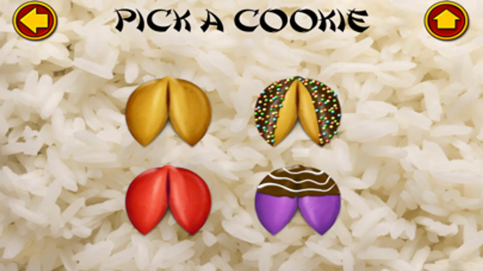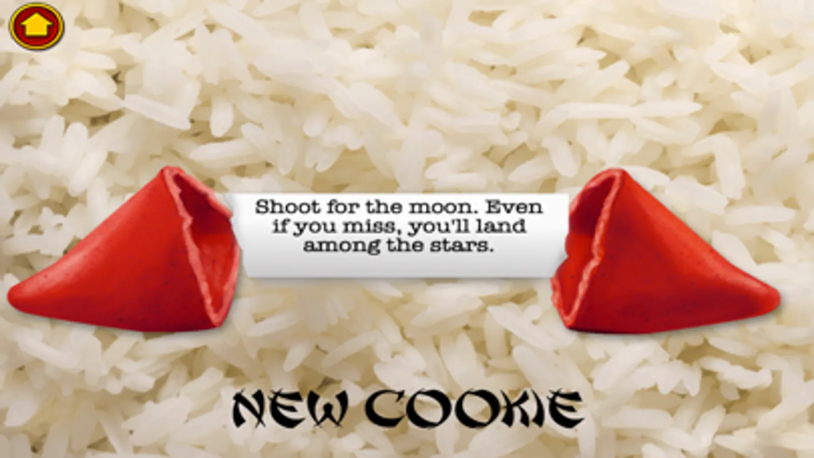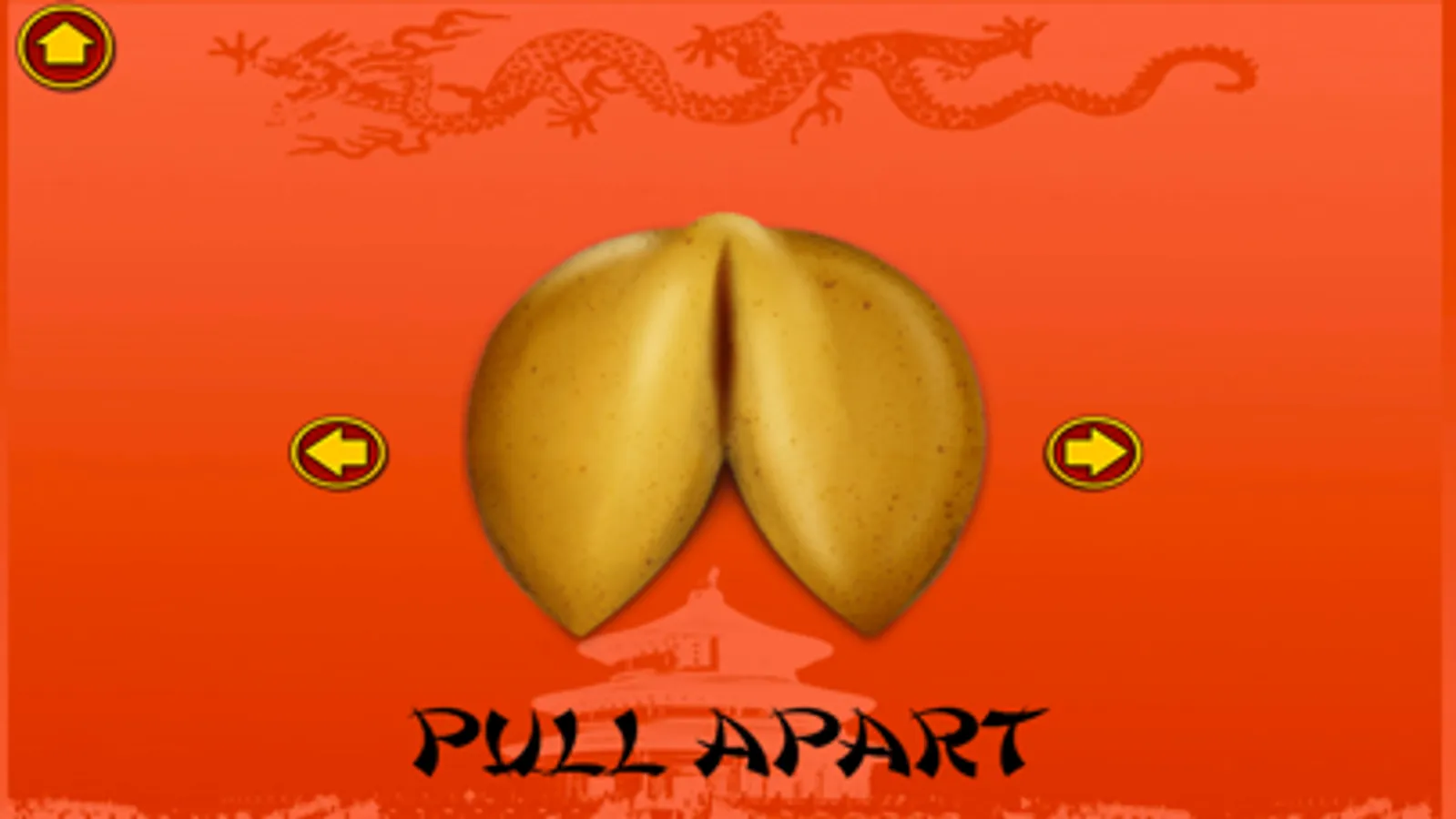 Instructions for Fortune Cookies: Pull apart cookie with fingers. Hear crunch. Voila, fortune revealed! Tap new cookie to start again or tap home to select a different cookie color. Random fortunes displayed after cookie broken in half.