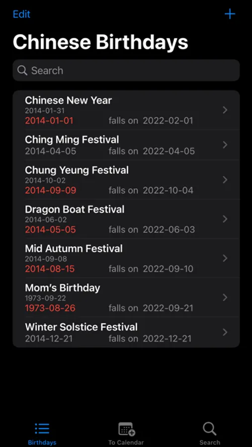 It's easy to remember what day Chinese New Year falls on, for example, and setup a calendar alert. In the app, just create an entry for Chinese New Year (first day of the first month in the Chinese Calendar), then allow the app to save the converted date(s) into your calendar with an alert. Repeat as desired for any other lunar date that's important to you.