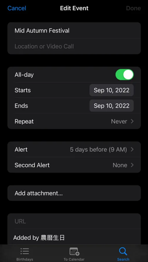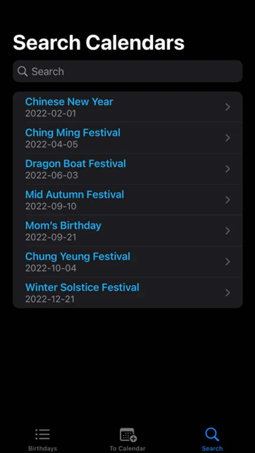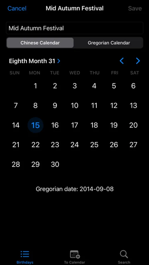 - maintain a custom list of birthdays/events, following either the Chinese or Gregorian Calendar