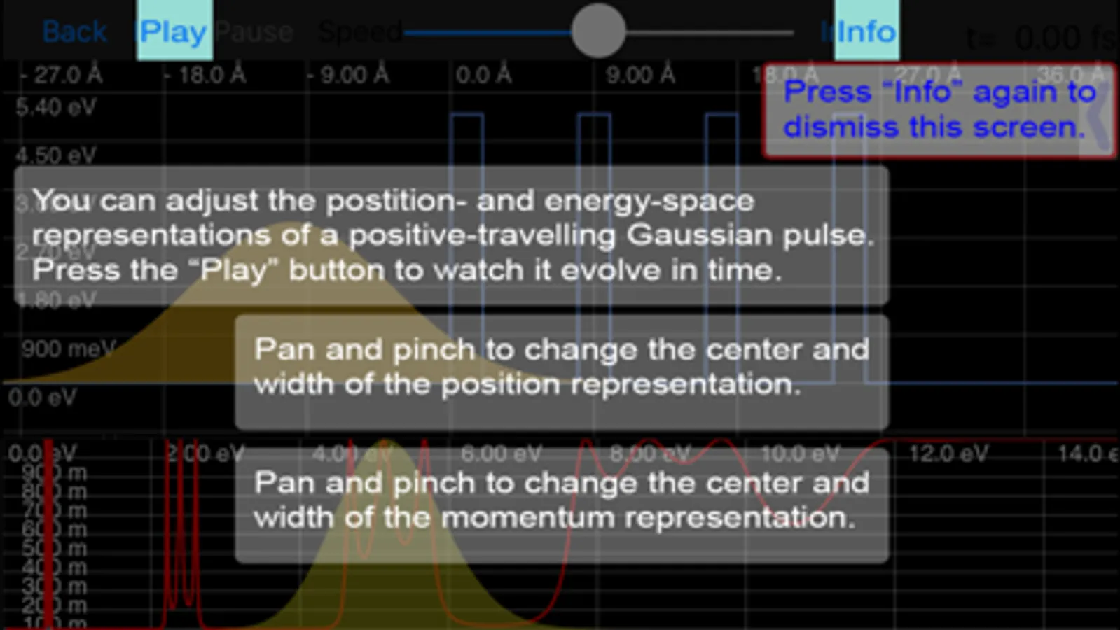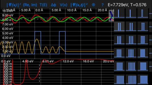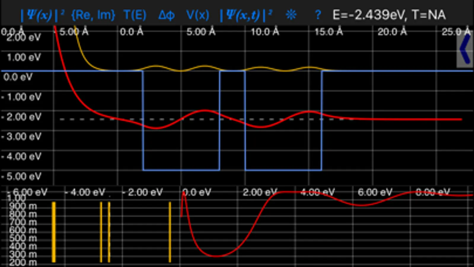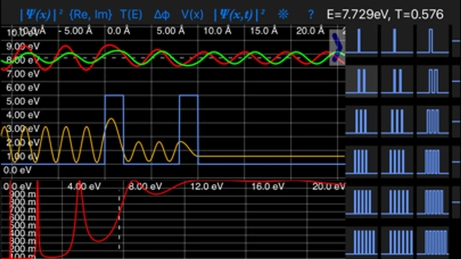 Interactive plots illustrating material typically covered in university introductory quantum mechanics classes. With this app you manipulate the energy of an electron in a series of one-dimensional potentials, observing bound and scattering states, as well as the time-development of Gaussian pulses.