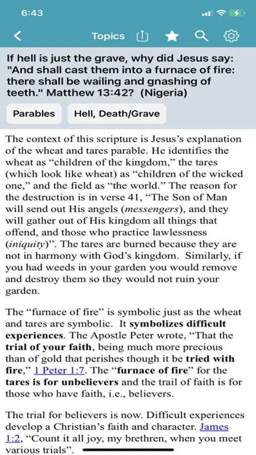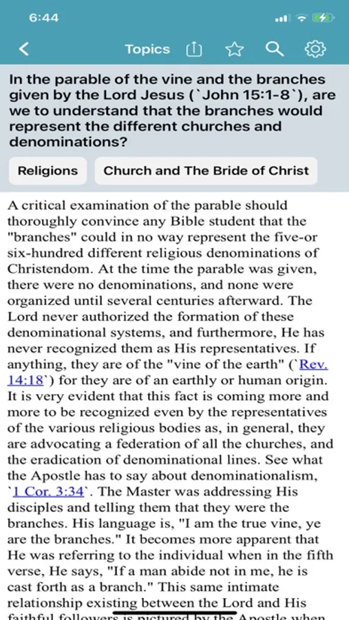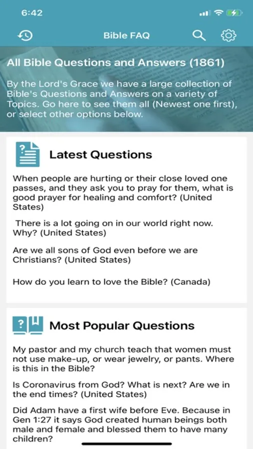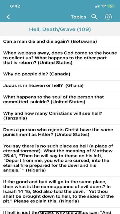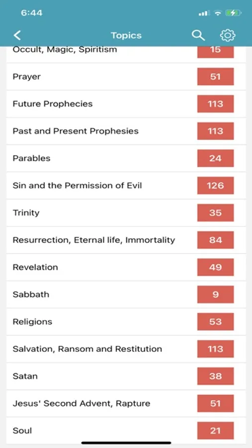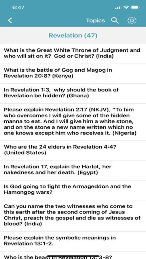 Here is a list of all categories that the app includes: Parables,Past and Present Prophesies,Future Prophecies,Prayer,Occult, Magic, Spiritism,Miscellaneous Bible Questions,Mosaic Law, Tabernacle, Tithes,Marriage,Miracles,Life Decisions and Doing the will of God,Kingdom and the Millennium,Judgment,Jesus’ Life, Teachings, and Death,Israel, Middle East,The Holy Spirit,God, Faith,Heaven and Earth,Hell, Death/Grave,Creation, Evolution,Chronology,Church history, False church,Church and The Bride of Christ,Christian Character and Conduct,Baptism,Bible and Bible Characters,Antichrist,Angels, Spirit Beings,Trinity,Resurrection, Eternal life, Immortality,Revelation,Sabbath,Religions,Salvation, Ransom and Restitution,Satan,Jesus’ Second Advent, Rapture,Soul