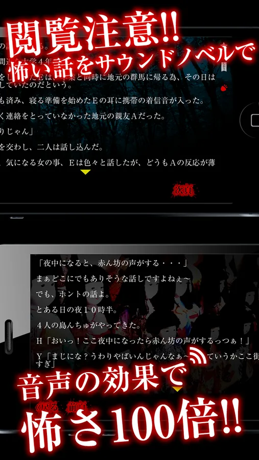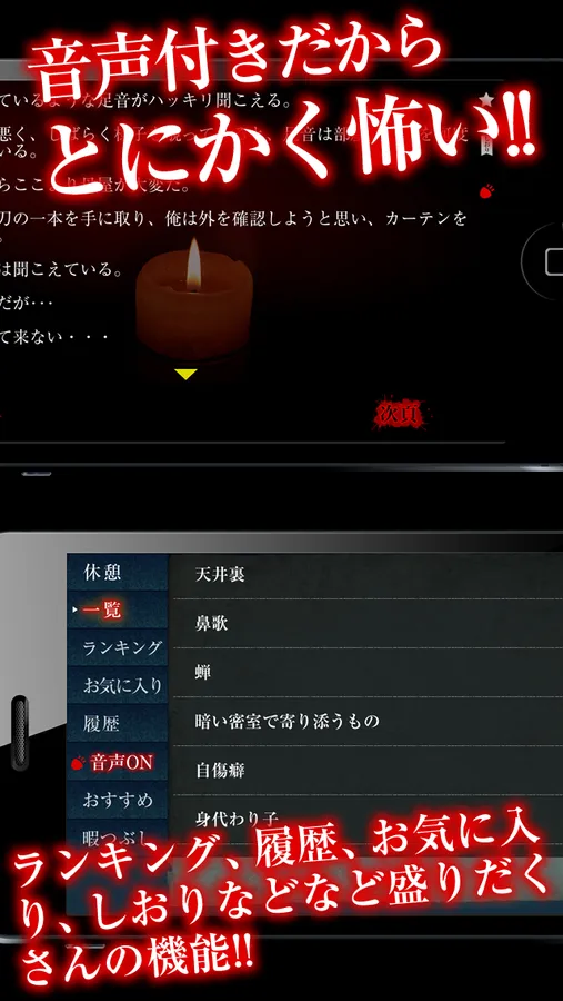 『怖いサウンドノベル』は数々の怖い話をサウンドノベル方式で楽しむことができます。