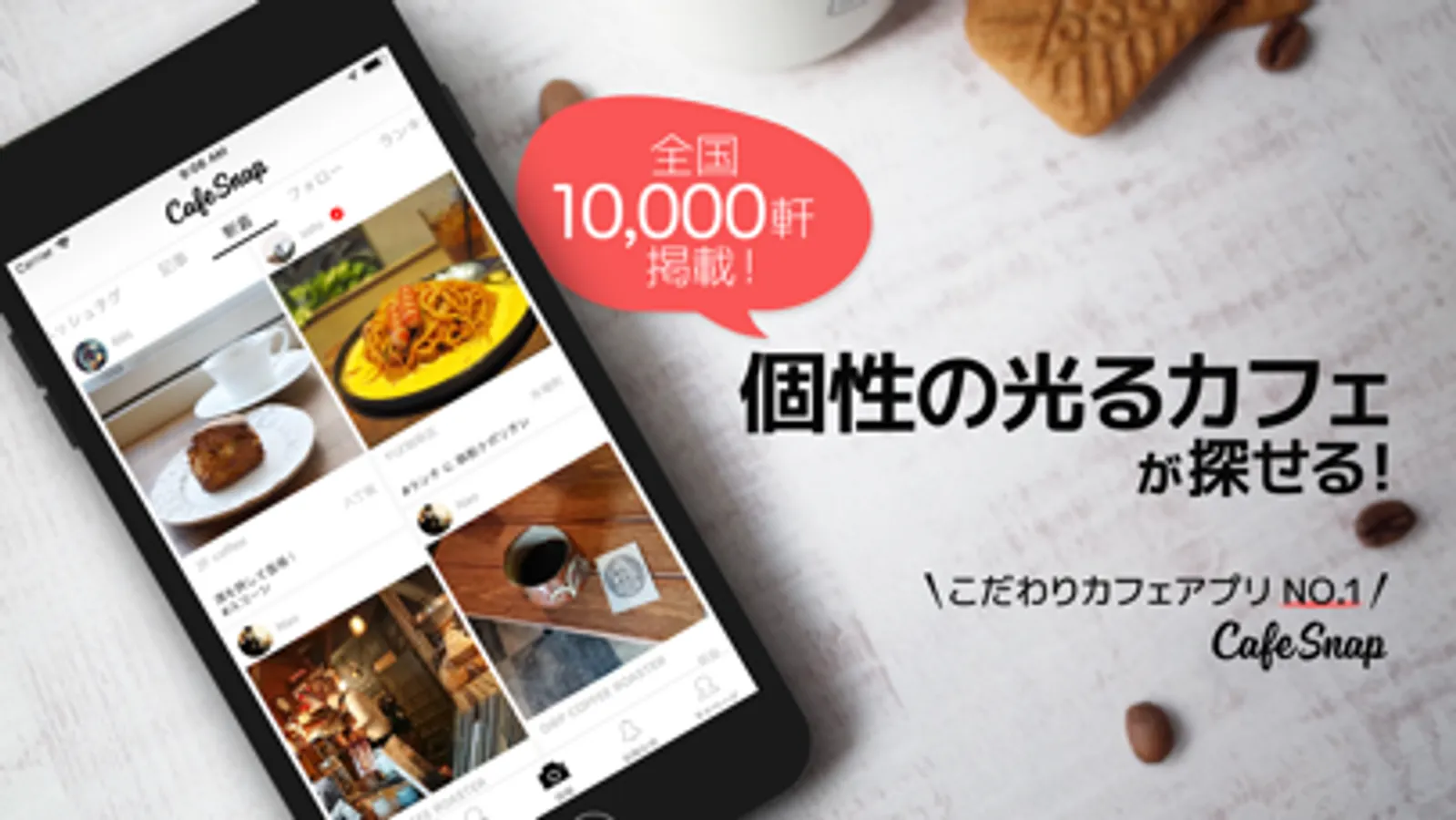 ・CafeSnapは、みんなが参加できる写真共有型のアプリです。カフェ好きユーザーによって日々投稿される写真で、カフェの最新情報を知ることができます。