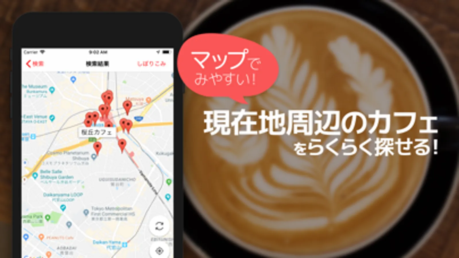 ボタンひとつで、現在地周辺のカフェが探せます。Googleマップと連動し、あなたをお店までナビゲートします。
