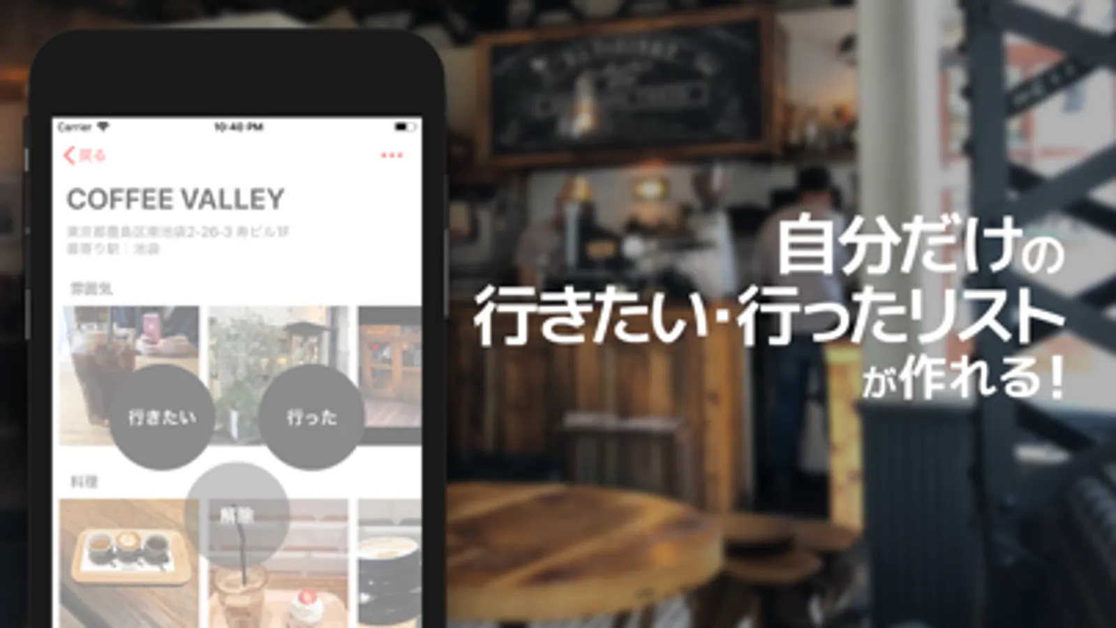 自分好みのお店を「行きたい」「行った」でブックマーク登録することで、自分だけのカフェリストが作れます。