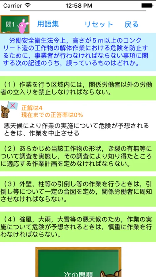 一問一答形式からなり、回答後、正答率も確認できます。