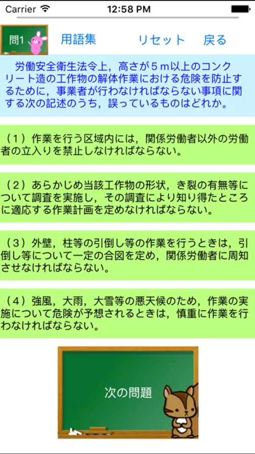自動で間違えた問題を記憶し、間違えた問題、まだ解いていない問題を優先的に出題します。またセーブ機能がついているため、途中でやめても再度立ち上げた時に続きから問題を解くことができるので、効率よく勉強をすすめることができます(データは各科目ごとにmenuボタンからリセットすることができます)